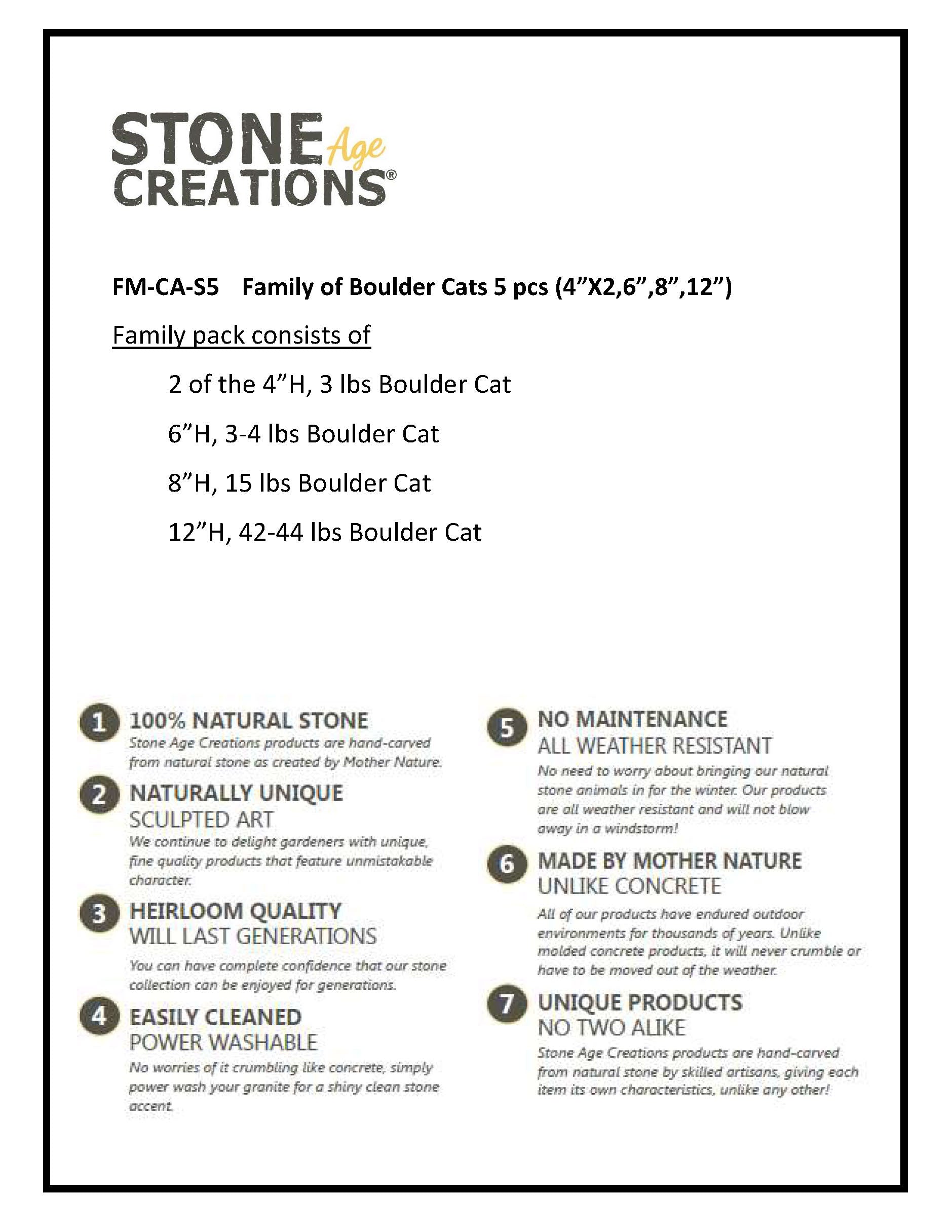 This adorable Family of Boulder Cats would be a great addition around your garden or in your home. They also make perfect gifts! They are made from Natural Granite Boulder with hand carved accents. Since each boulder pet is hand carved it is unique in shape and color. This 5 piece set includes two 4" 1-2lb one 6" 3-4lb one 8" 12-14lb & one 12" 42-44lb Boulder Cat. Height and weight are approximate.