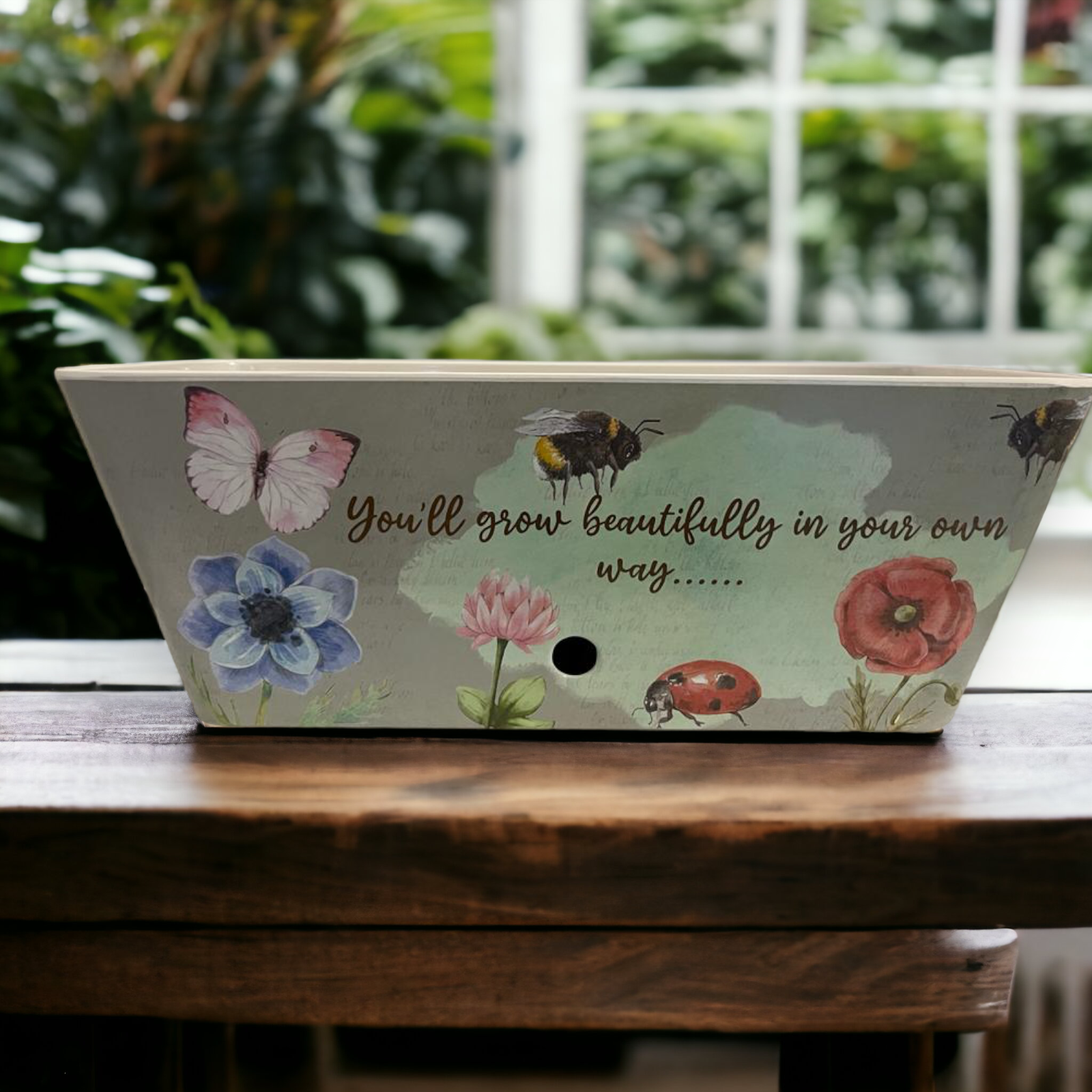 Worlds first Bamboo Fiber self-watering pot this 16" Flowers Rectangular self-watering planter is made from sustainable biodegradable all natural Bamboo Fiber and corn starch. Plants thrive in this natural Bamboo Fiber planter that is plastic free. The soil is better aerated by the unique water well in the base allowing better nutrient management helping the plants grow healthy and strong. These planters should be treated like ceramic suitable for use in hot or cold climates inside or outside. At initial planting water from the top until water is just below the overflow. Then periodically check the water level in the base and add water to the well from the bottom access or from the top of the planter. The soil draws water up from the well as needed using capillary action just like a wick. No more overwatering strong healthy plants is the result! Everyone gets a "green thumb" growing in bamboo planters and just by keeping water in the well! When you are finished with your planter just break it up and put into your compost bin. Over time the material will degrade back to nature.