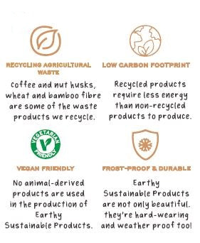 This unique Seed Bird Feeder is made with Coffee Husks. The Earthy Sustainable line processes agricultural waste blending it with resin. A lot of time energy and water goes into growing crops yet most of the plant goes unwanted and would normally be burnt releasing harmful CO2 into the environment. Instead the waste material is processed to create Earthy sustainable products. None of the ingredients are grown specifically for Earthy. The unwanted parts of commercially-farmed crops are used to make our feeders. These products are frost proof and suitable for outdoor and indoor use. Lifespan 2-3 years. Dimensions are 6.1"W x 5.7"D x 8.7"H.