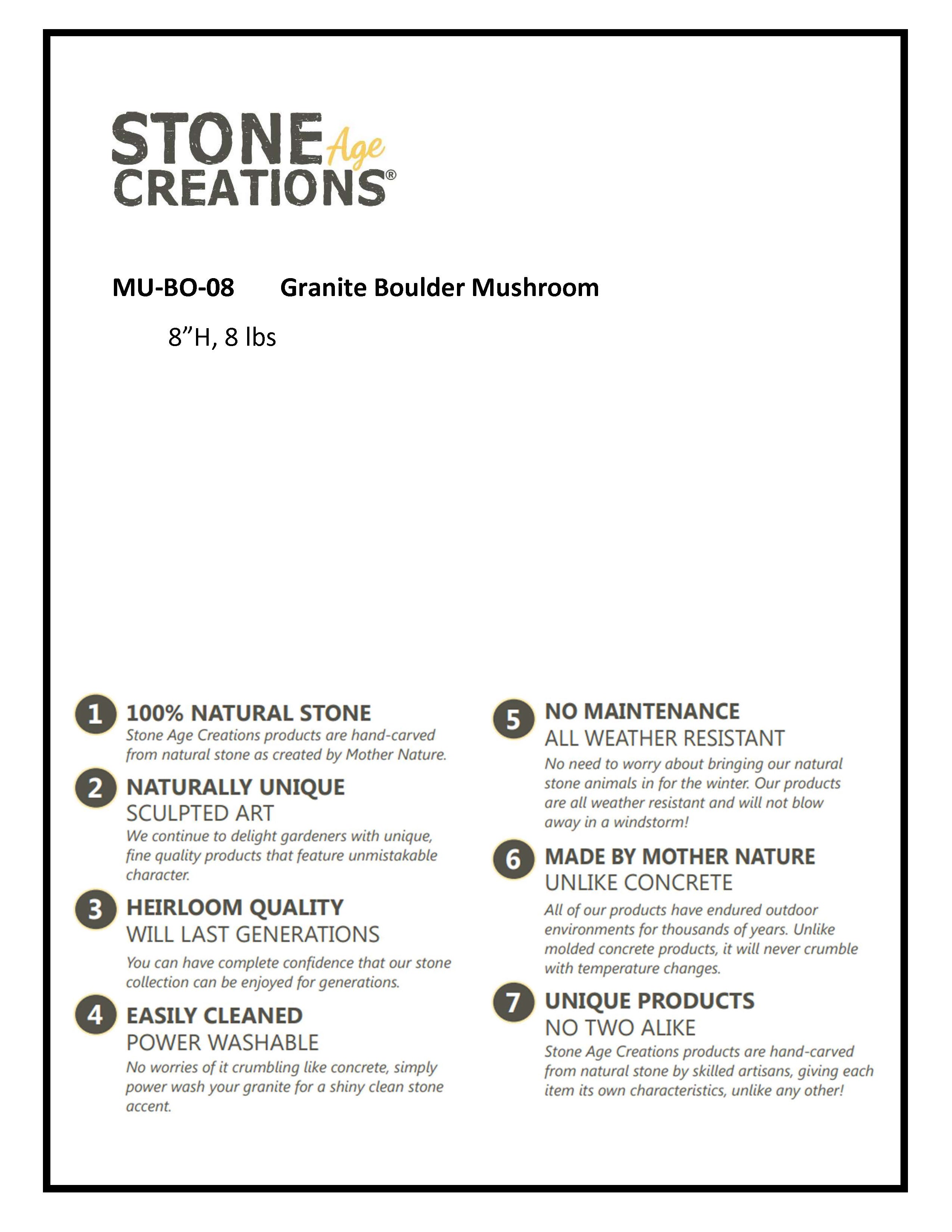 Our whimsical stone mushrooms can be found peeking out of gardens across the country!Natural Granite Boulder. 8"H approx 8 lbs