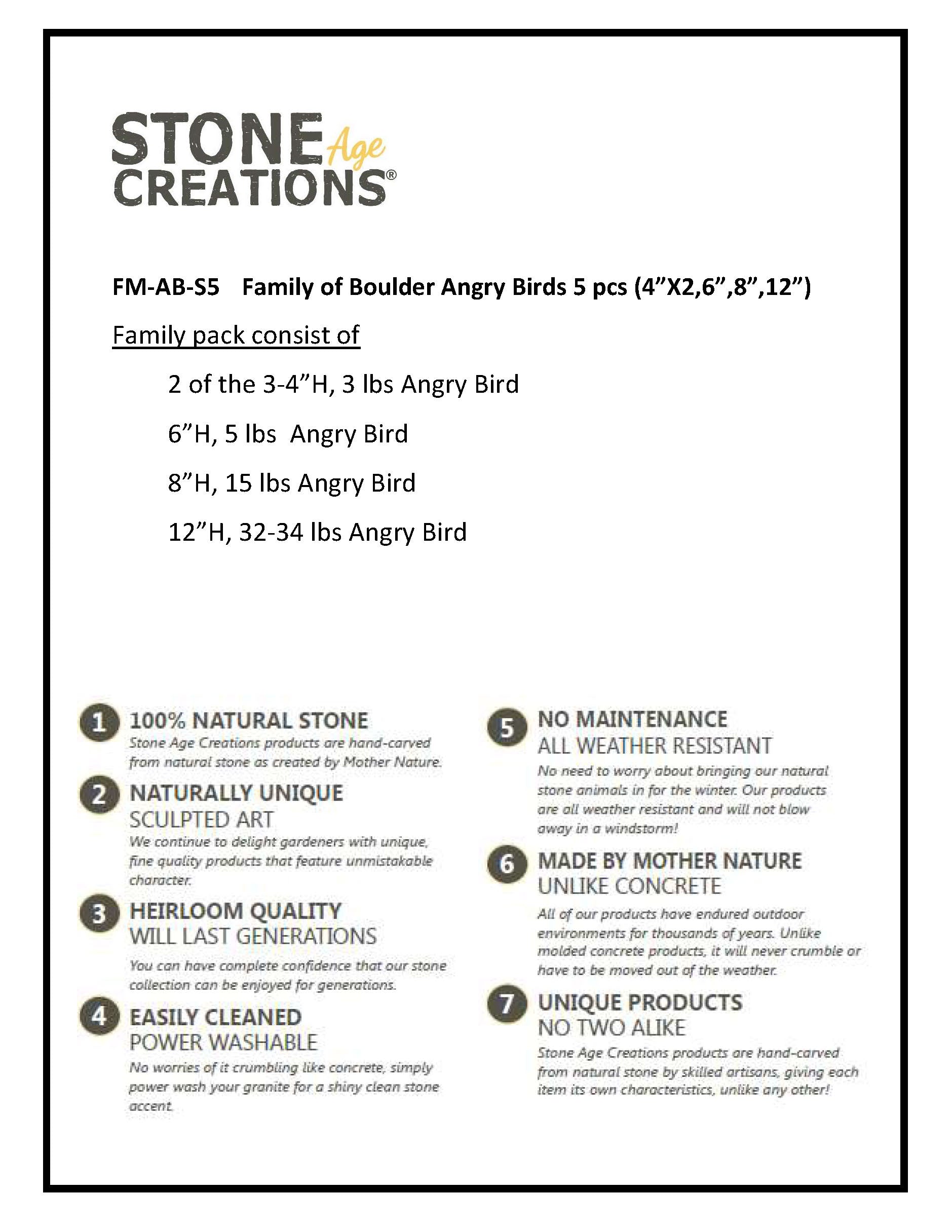 This adorable Family of Boulder Angry Birds would be a great addition around your garden or in your home. They also make perfect gifts! They are made from Natural Granite Boulder with inlaid quartz eyes. Since each boulder pet is hand carved it is unique in shape and color. This 5 piece set includes two 3-4" 1-2lb one 6" 3-4lb one 8" 15-17lb & one 12" 32-34lb Angry Bird. Height and weight are approximate.